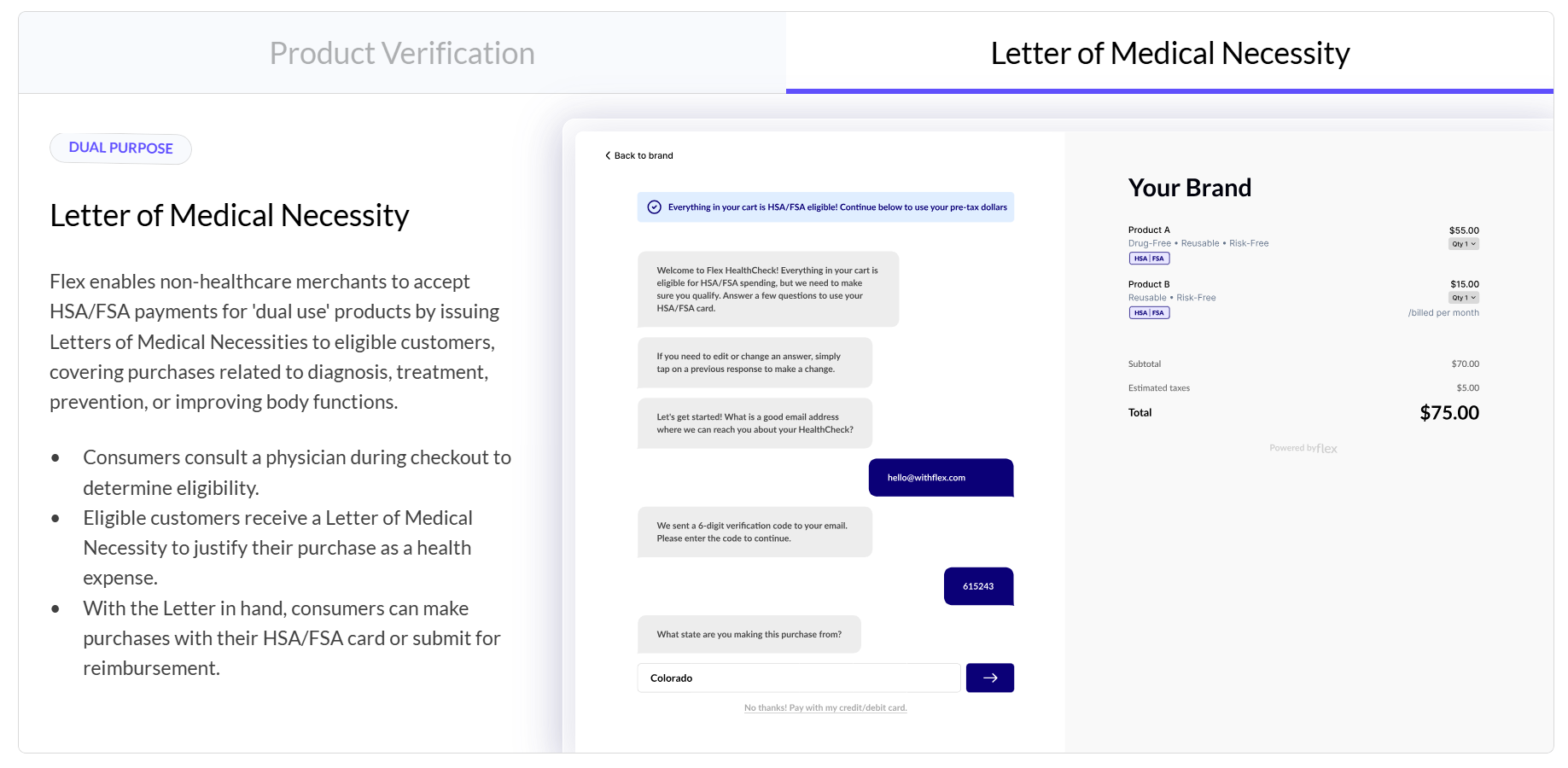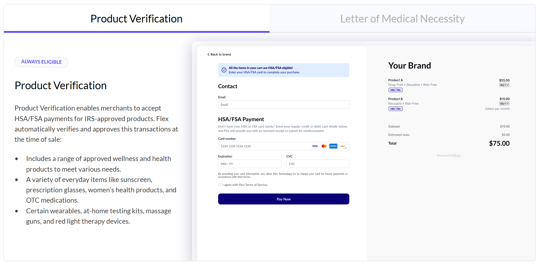- ✅ Automatic Verification: Flex automatically verifies that the items in your cart are HSA/FSA eligible.