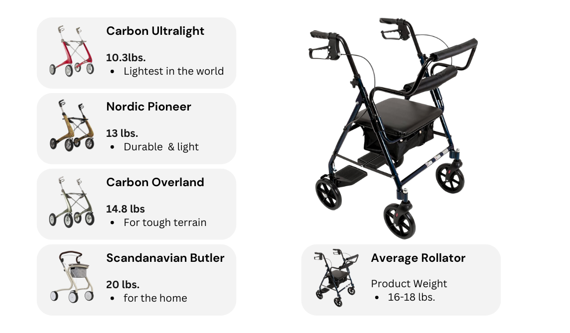 The Carbon Overland is the world’s lightest all-terrain rollator at only 14.8 lbs.