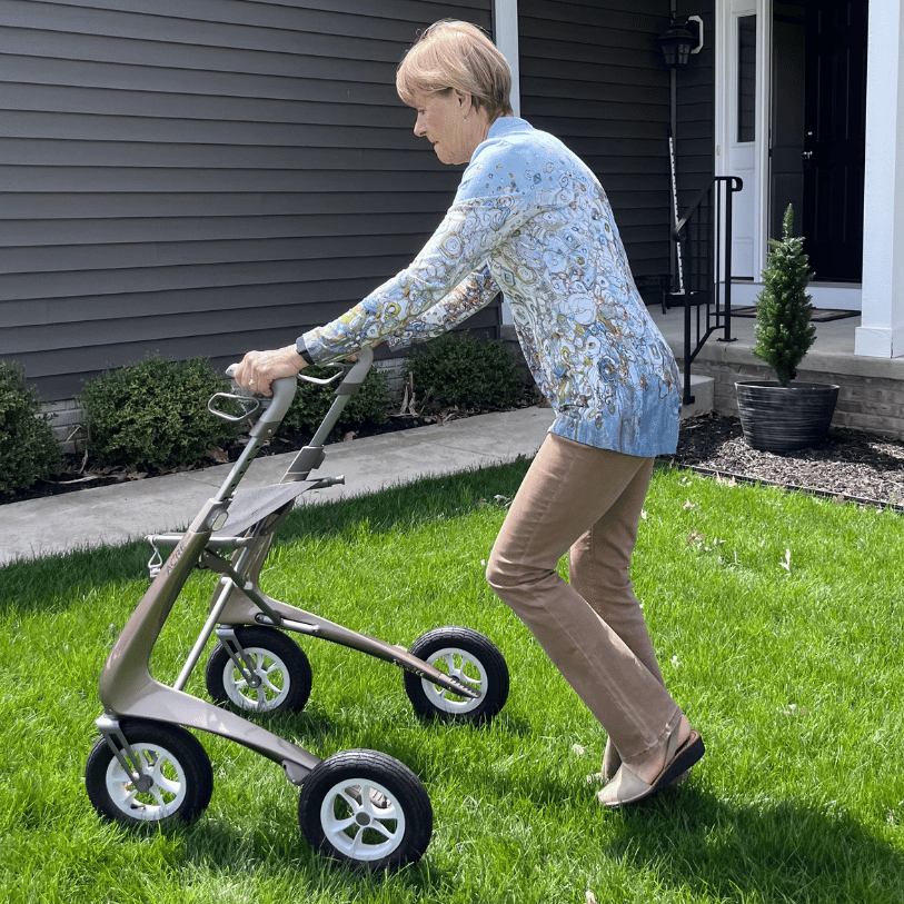 An offroad and all terrain rollator is, as the name suggests, a rollator that can conquer every off road terrain such as snow, sand, gravel roads, grass and hills.