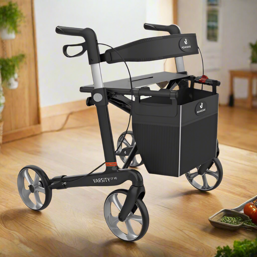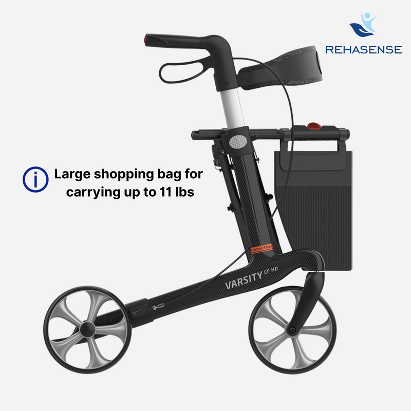 The Rehasense Varsity Carbon Fiber Heavy Duty Premium Rollator combines strength, lightweight design, and modern style for unmatched mobility support. Crafted with carbon fiber, it provides maximum durability while remaining easy to maneuver. Built to accommodate higher weight capacities, this rollator is ideal for users seeking stability, confidence, and comfort both indoors and outdoors.